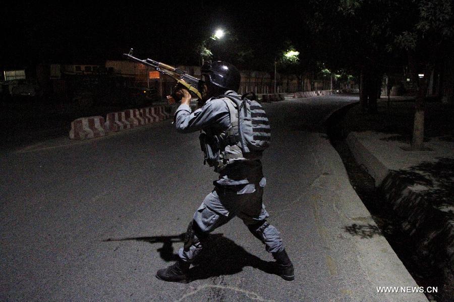 An Afghan policeman aims his weapon close to the site of an attack by Taliban militants on foreign guest house in Kabul, Afghanistan, May 27, 2015. Casualties were feared as explosions and ensuing gunshots rocked a diplomatic district in the central part of Kabul Tuesday night, sources and witnesses said. (Xinhua/Ahmad Massoud)