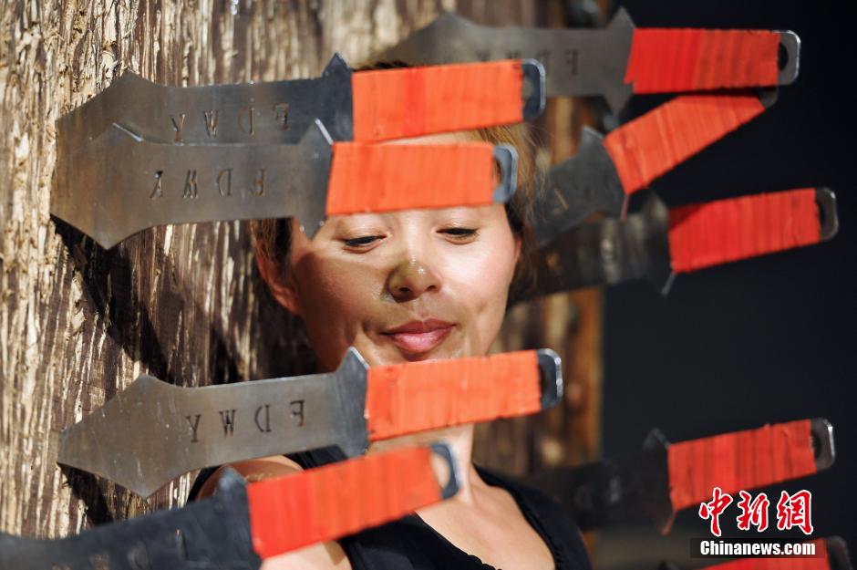 Wang Yong and Zhao Qian have been folk artists for more than 10 years. They learned acrobatics in a troupe from a very young age. Their “knives-throwing” performance is both thrilling and controversial.(Photo/CNS)