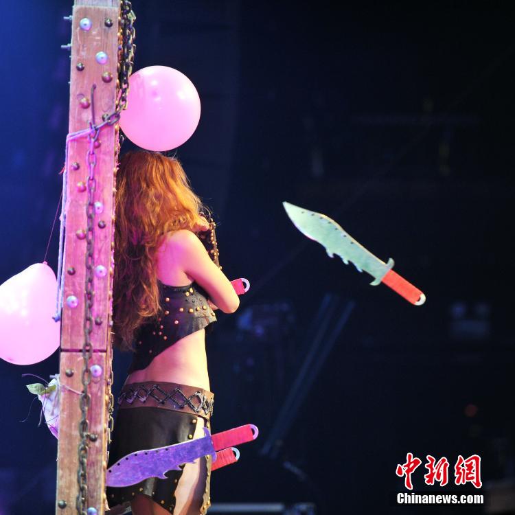 Wang Yong and Zhao Qian have been folk artists for more than 10 years. They learned acrobatics in a troupe from a very young age. Their “knives-throwing” performance is both thrilling and controversial.(Photo/CNS)