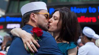 Two performers dance during the Times Square Kiss-in event in New York, the United States, Aug. 14, 2015. Hundreds of couples on Friday participated the celebrations recreating the kiss between an American sailor and nurse captured by Life Magazine photographer Alfred Eisenstaedt 70 years ago, when Americans celebrated the V-J Day at Times Square, marking the victory over Japan that ended the war in 1945.(Xinhua/Li Muzi)