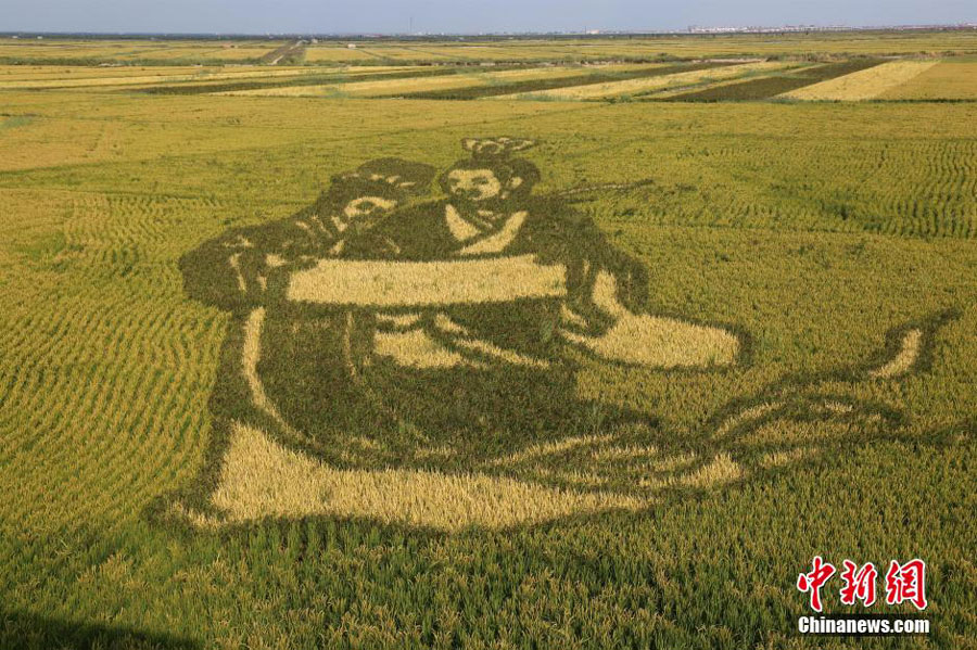 3D images are seen on a rice field in Panjin, Northeast China's Liaoning Province, on September 3, 2015. The images feature themes of Chinese legends and historical stories. [Chinanews.com]
