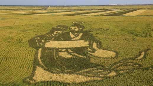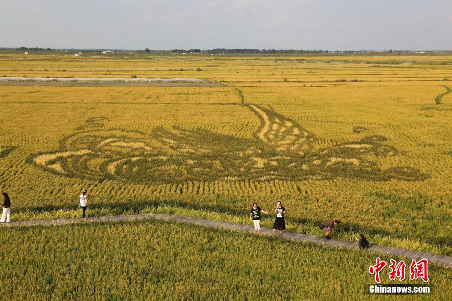3D images are seen on a rice field in Panjin, Northeast China's Liaoning Province, on September 3, 2015. The images feature themes of Chinese legends and historical stories. [Chinanews.com]