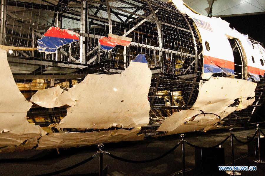 Wreckage of flight MH17 is seen after the presentation of the investigation report on the cause of its crash, at the Gilze-Rijen air base, the Netherlands, on Oct. 13, 2015. The crash of flight MH17 on 17 July last year was caused by the detonation of a 9N314M-type warhead launched from eastern Ukraine using a Buk missile system, said the investigation report published Tuesday by the Dutch Safety Board (DSB). (Xinhua/Sylvia Lederer)