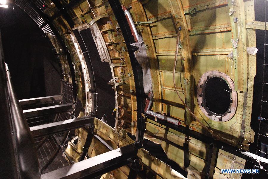 Wreckage of flight MH17 is seen after the presentation of the investigation report on the cause of its crash, at the Gilze-Rijen air base, the Netherlands, on Oct. 13, 2015. The crash of flight MH17 on 17 July last year was caused by the detonation of a 9N314M-type warhead launched from eastern Ukraine using a Buk missile system, said the investigation report published Tuesday by the Dutch Safety Board (DSB). (Xinhua/Sylvia Lederer)