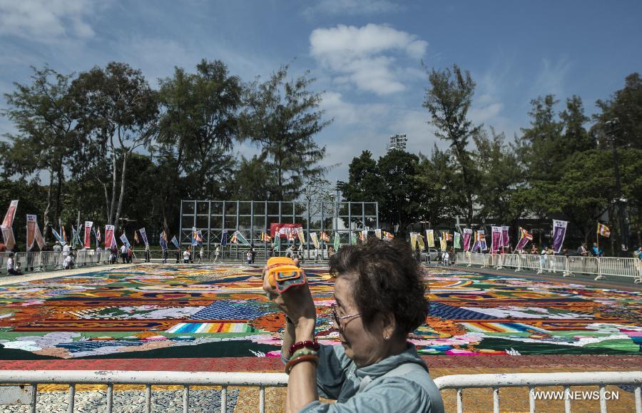 People attend a buddhist ritual at the Victoria Park in Hong Kong, south China, Nov. 3, 2015. A 38-meter-long Buddha tangka were displayed at the ritual here on Tuesday. (Xinhua/Lui Siu Wai)