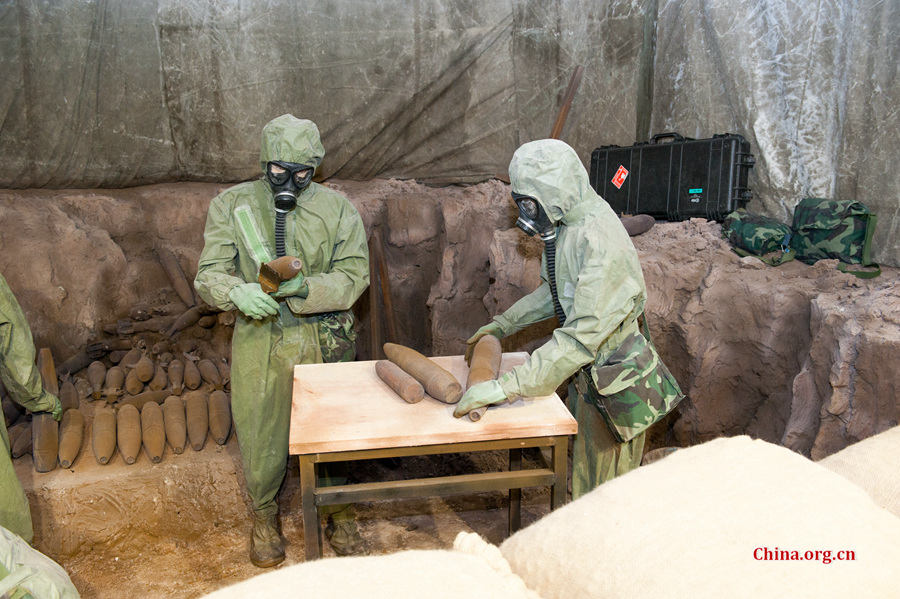 A simulated scenario shows the recovery and disposal of chemical weapons abandoned by invading Japanese troops in China. [Photo by Chen Boyuan / China.org.cn]
