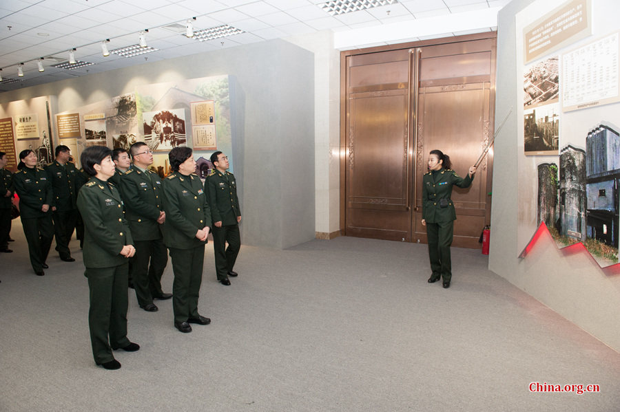 PLA officers attend the exhibition on the disposal of the chemical weapons abandoned in China during the World War II at the Military Museum of the Chinese People's Revolution in Beijing. [Photo by Chen Boyuan / China.org.cn] |