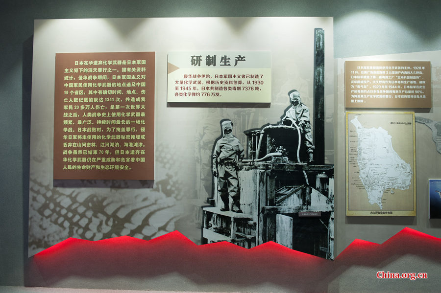 At the starting of the Chinese People's War of Resistance Against Japanese Aggression, the Japanese troops had already produced a large number of chemical weapons. Historical data show that between 1930 and 1945, Japan produced 7,376 tons of various toxicants, and 7.76 million of various chemical shells. [Photo by Chen Boyuan / China.org.cn] |
