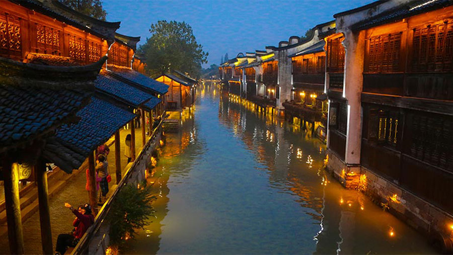 Photo shows the night view of Wuzhen, east China's Zhejiang Province. The World Internet Conference will be held in Wuzhen from Dec. 16 to 18. [Photo/Chinadaily.com.cn]