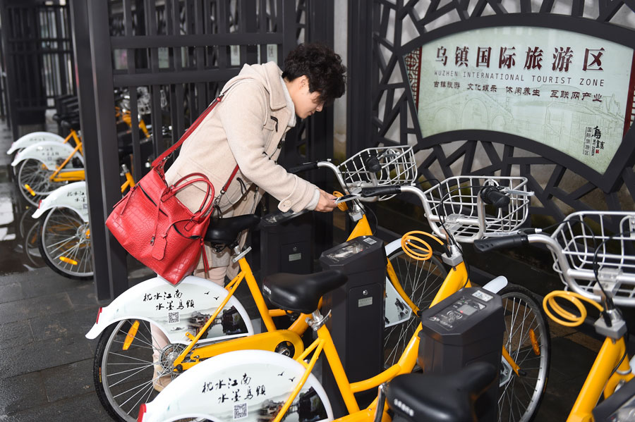 A woman scans a code to rent a bike in Wuzhen, Dec 12, 2015. A total of 26 bicycle rental systems are spread throughout the town, people can help themselves to rent bikes by scanning two-dimensional codes. [Photo/Xinhua] |