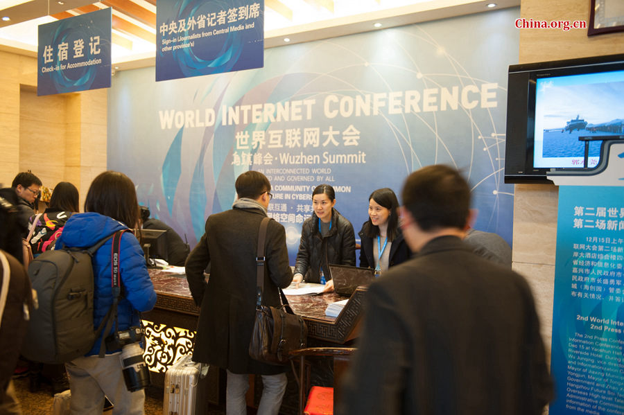 Journalists, arriving for the second World Internet Conference (WIC) Wuzhen Summit, line up for registration at the Gold River Bank Hotel in Wuzhen one day before the summit opens. [Photo by Chen Boyuan / China.org.cn]