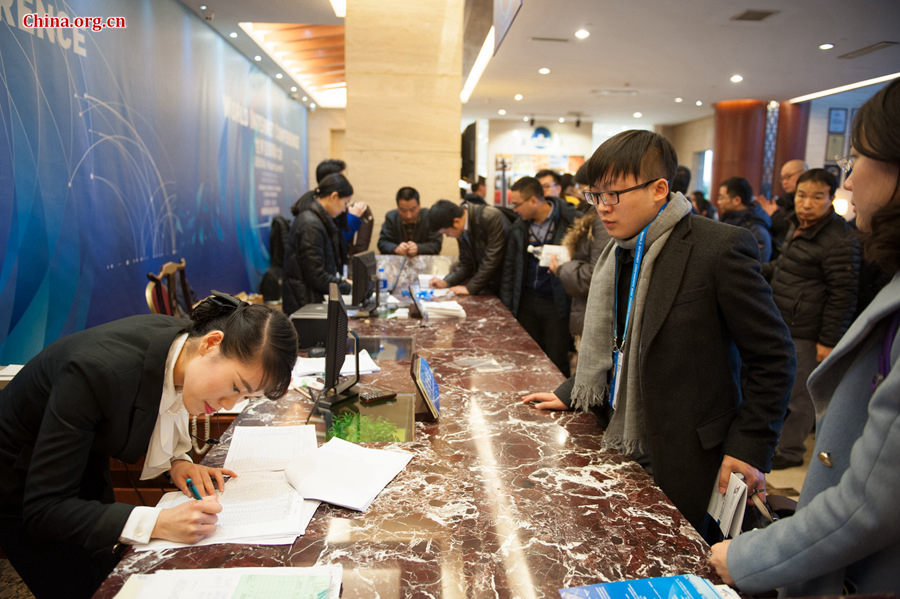 Journalists, arriving for the second World Internet Conference (WIC) Wuzhen Summit, line up for registration at the Gold River Bank Hotel in Wuzhen one day before the summit opens. [Photo by Chen Boyuan / China.org.cn] |