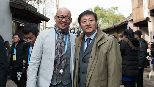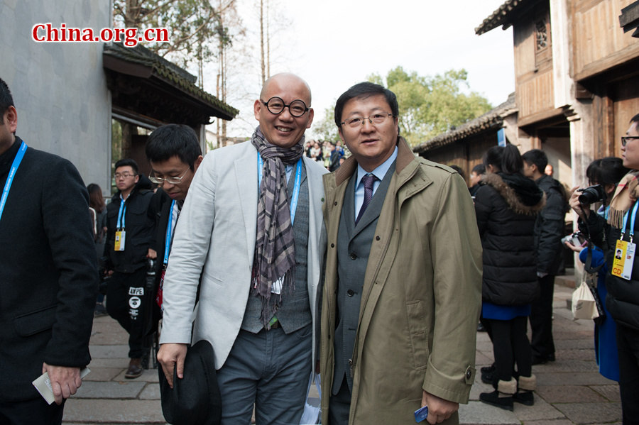 Wang Xiaohui (R), editor-in-chief of China.org.cn poses for a photo with a guest after the opening ceremony of the 2nd World Internet Conference (WIC) held on Dec. 16 in Wuzhen, east China's Zhejiang Province. [Photo by Chen Boyuan / China.org.cn] |