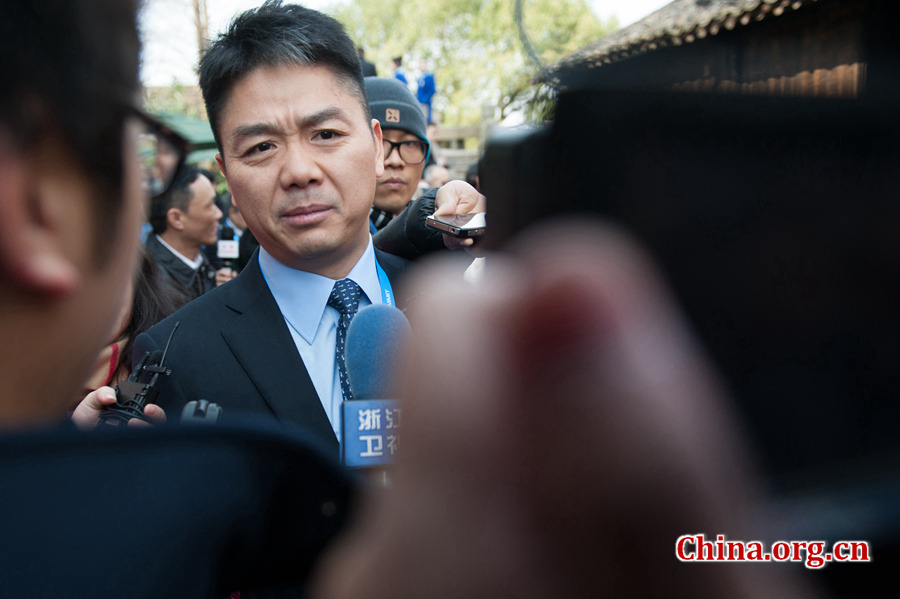 Liu Qiangdong, also known as Richard Liu, founder and CEO of JD.com or Jingdong Mall, exits the opening ceremony venue of the 2nd World Internet Conference (WIC) held on Dec. 16 in Wuzhen, east China's Zhejiang Province. [Photo by Chen Boyuan / China.org.cn] |