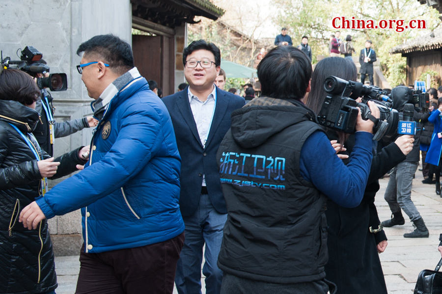 Ding Lei, also known as William Ding, the founder and CEO of NetEase, exits the opening ceremony venue of the 2nd World Internet Conference (WIC) held on Dec. 16 in Wuzhen, east China's Zhejiang Province. [Photo by Chen Boyuan / China.org.cn] |