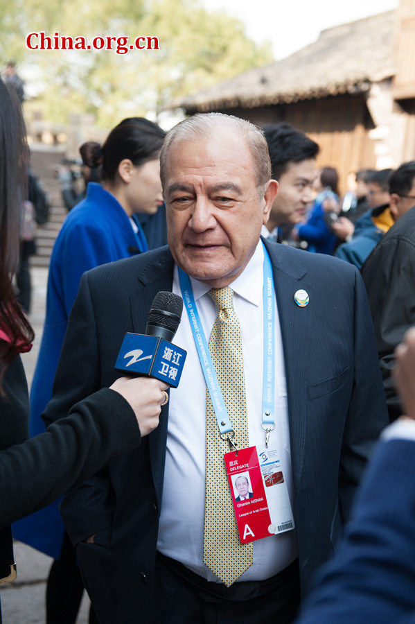 Ghanim Al-Shibli, the Arab League's ambassador to China, takes questions from local press after the opening ceremony of the 2nd World Internet Conference (WIC) held on Dec. 16 in Wuzhen, east China's Zhejiang Province. [Photo by Chen Boyuan / China.org.cn] |