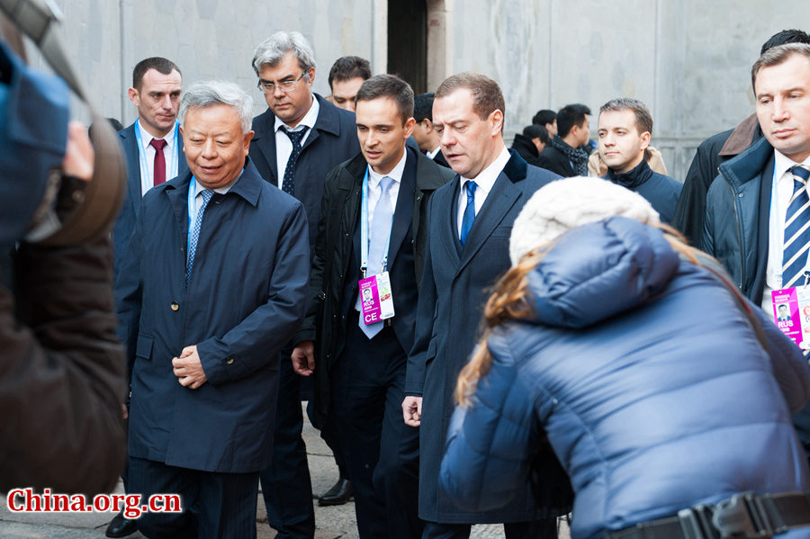 Dmitry Medvedev, Prime Minister of Russia, exits the opening ceremony venue of the 2nd World Internet Conference (WIC) with a personal security detail on Dec. 16 in Wuzhen, east China's Zhejiang Province. [Photo by Chen Boyuan / China.org.cn] |