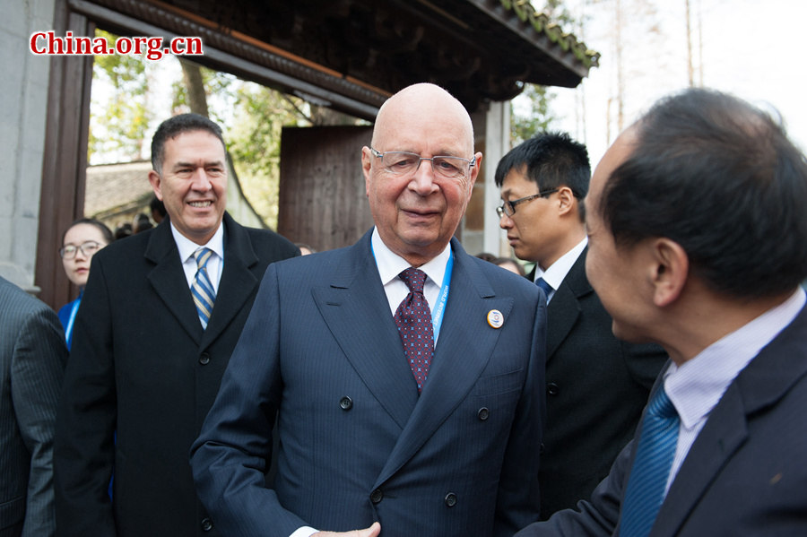 Klaus Schwab, the founder and executive chairman of the World Economic Forum (WEF) or the Davos Forum, exits the opening ceremony venue of the 2nd World Internet Conference (WIC) held on Dec. 16 in Wuzhen, east China's Zhejiang Province. [Photo by Chen Boyuan / China.org.cn] |