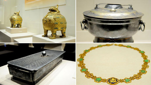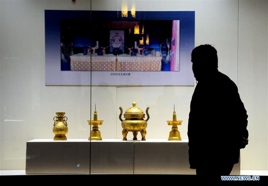 A man views royal goldware and silverware on display at the Shenyang Palace Museum in Shenyang, northeast China's Liaoning Province, March 13, 2016. The ongoing exhibition, displaying over 100 pieces of royal goldware and silverware of Qing Dynasty (1644-1911), will last until April 25. (Xinhua/Zhang Wenkui)