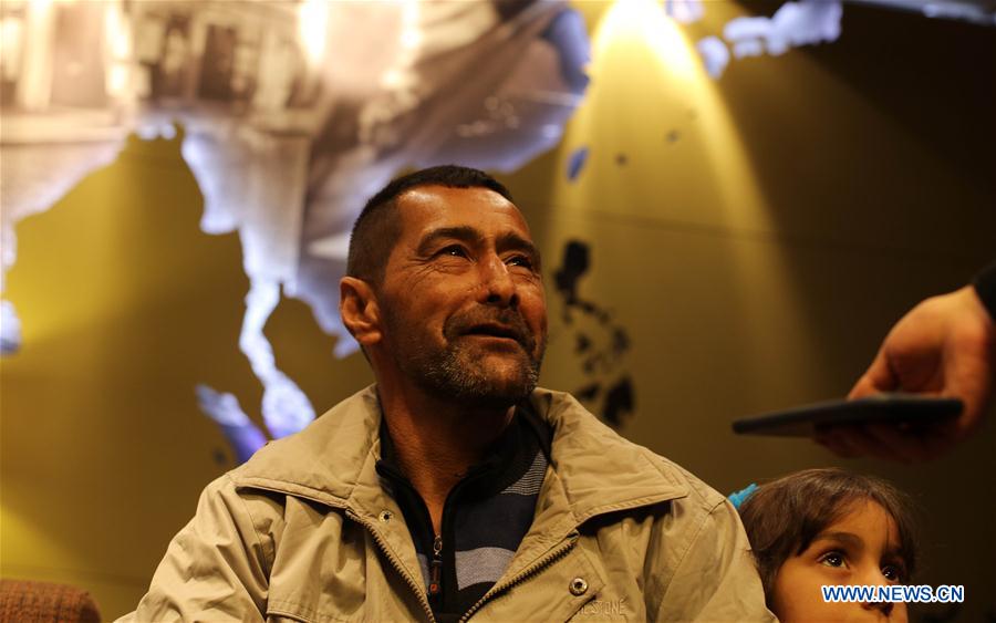 Syrian refugee Ahmad al Aboud, who will be resettled in the United States with his family as part of the American Syrian Asylum Programme, speaks to media at the International Airport of Amman, April 6, 2016. (Xinhua/Mohammad Abu Ghosh)