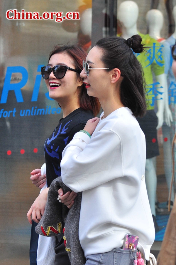 A chic girl with a half bun (R) walks through the Sanlitun streets in Beijing's eastern Chaoyang District with her friend on April 1, 2016. [Photo by Guo Yiming / China.org.cn] |