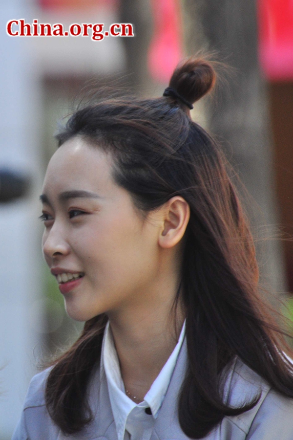 A girl with a half bun walks through the Sanlitun streets in Beijing's eastern Chaoyang District on April 1, 2016. [Photo by Guo Yiming / China.org.cn]