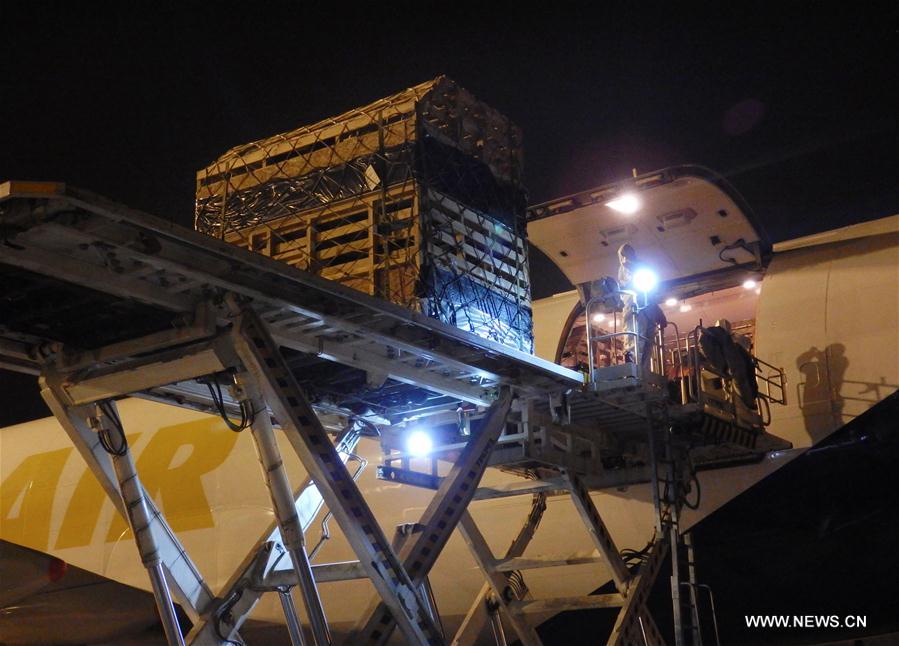 Working staff unload a crate of alpacas at Xinzheng International Airport in Zhengzhou, capital of central China's Henan Province, April 13, 2016. A total of 622 alpacas from Santiago, Chile, landed in Zhengzhou after 27 hours of flight. They will receive a 30-day quarantine before being bred and displayed as ornamental animals in the city. (Xinhua/Ma Yichong)