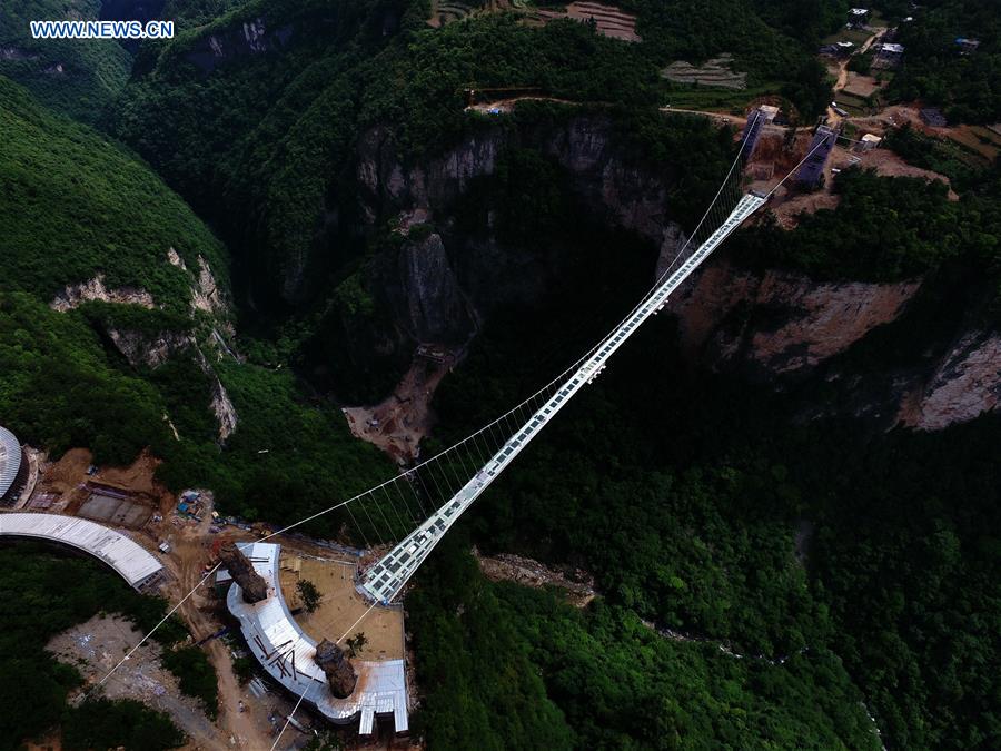 An aerial photo taken on May 17, 2016 shows the nearly finished construction site of a glass bridge at the Grand Canyon of Zhangjiajie National Forest Park, central China's Hunan Province. The 430-meter-long, 6-meter-wide bridge is expected to be put into a trial operation in May. The structure has undergone nearly 100 safety tests to ensure that it can support the weight of 800 people.[Photo: Xinhua]