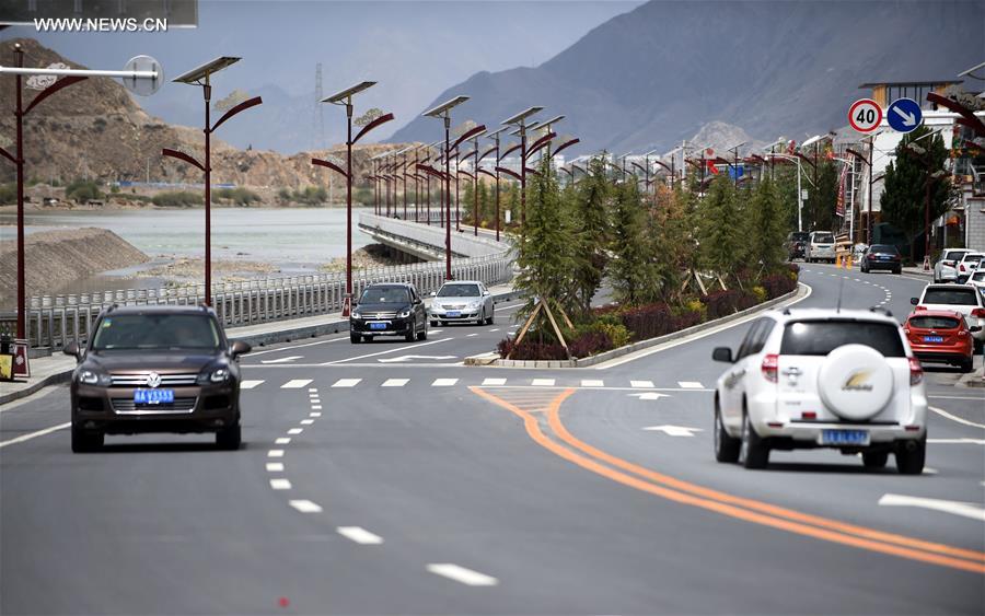Photo taken on May 22, 2016 shows a road along the Lhasa River in Lhasa, capital of southwest China's Tibet Autonomous Region. In the past 65 years, the city of Lhasa, which expanded its acreage to 100 square meters, has turned to be a mixed city, both ancient and modern. The Tibet region realized peaceful liberation on May 23, 1951. (Xinhua/Chogo)