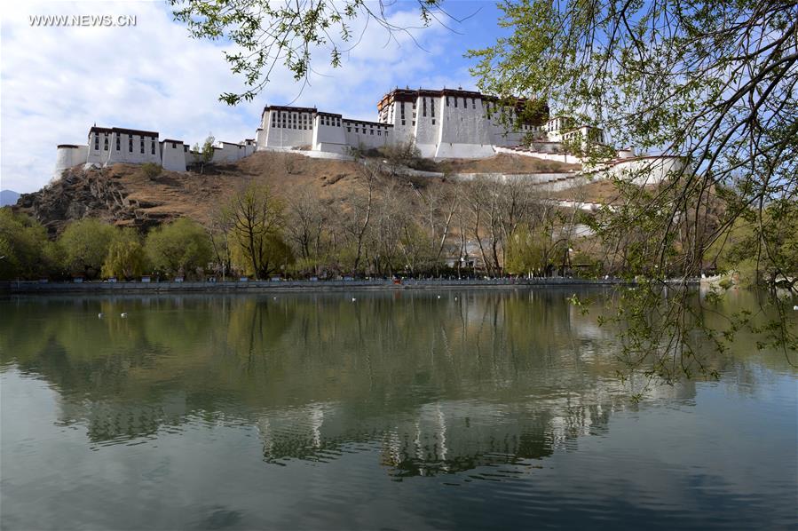 Photo taken on April 15, 2015 shows the scenery of Longwangtan Park in Lhasa, capital of southwest China's Tibet Autonomous Region. In the past 65 years, the city of Lhasa, which expanded its acreage to 100 square meters, has turned to be a mixed city, both ancient and modern. The Tibet region realized peaceful liberation on May 23, 1951. (Xinhua/Chogo)