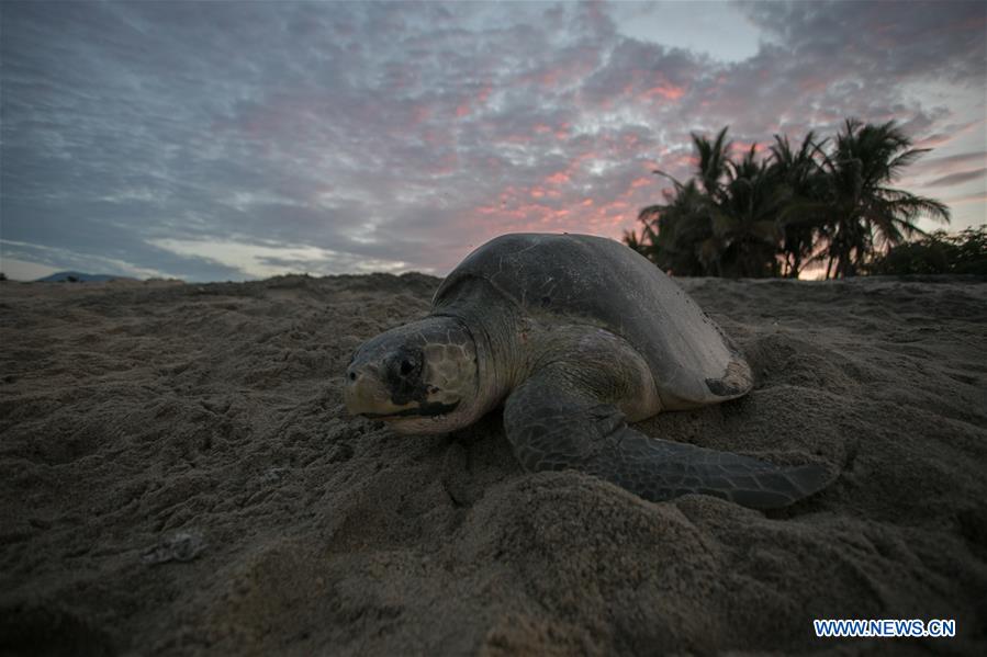An olive ridley turtle is seen on the Ixtapilla Beach in the State of Michoacan, Mexico, on July 31, 2016. At the end of July, thousands of olive ridley turtles have crawled across the Pacific coast to spawn, mainly in the states of Michoacan and Oaxaca. (Xinhua/Armando Solis)