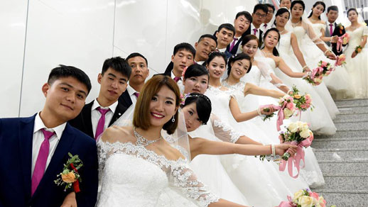 Newly-wed couples take part in a group wedding ceremony in Zhengzhou, capital of central China's Henan Province, Aug. 9, 2016. A group wedding ceremony was held here for city metro constructors on Qixi Festival, or Chinese Valentine's Day. (Xinhua/Li An)