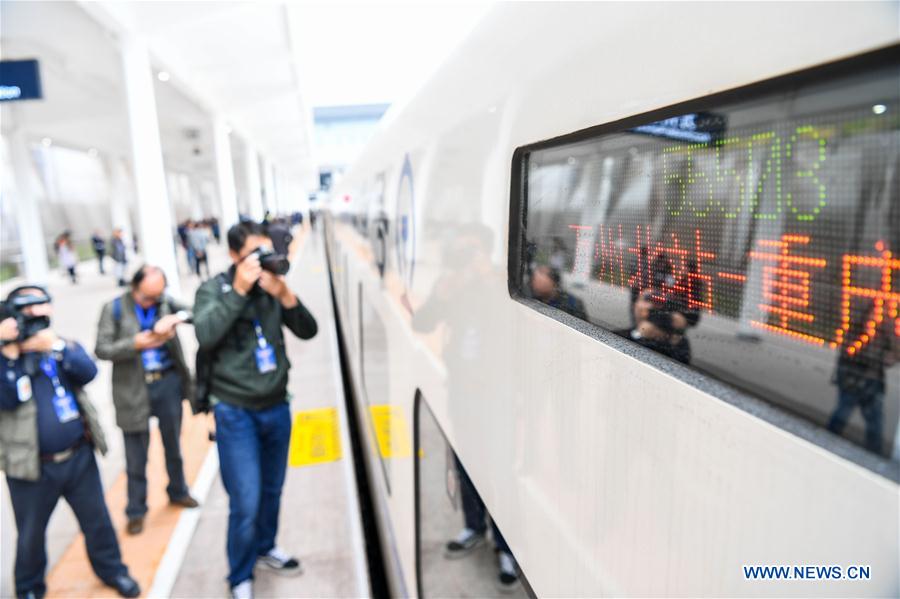 Journalists take photos of the train No. 55503 at Wanzhou North Railway Station in Chongqing, southwest China, Nov. 7, 2016. The Wanzhou-Chongqing section of Zhengzhou-Chongqing high-speed railway line started a simulation operation on Monday. The 247-kilometer-long section, designed with a speed of 250 km per hour, will be put into operation within this year. (Xinhua/Liu Chan)