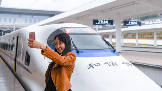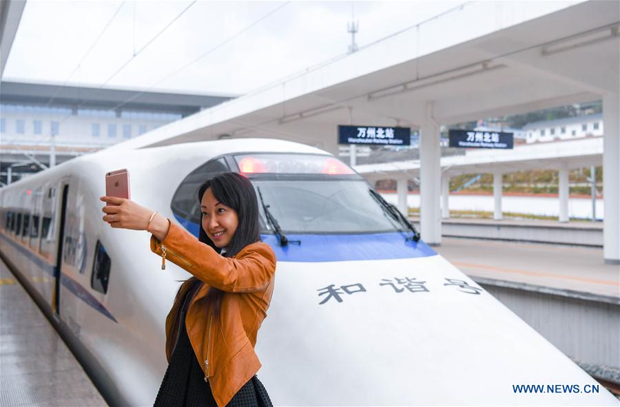A girl takes a selfie in front of a train at Wanzhou North Railway Station in Chongqing, southwest China, Nov. 7, 2016. The Wanzhou-Chongqing section of Zhengzhou-Chongqing high-speed railway line started a simulation operation on Monday. The 247-kilometer-long section, designed with a speed of 250 km per hour, will be put into operation within this year. (Xinhua/Liu Chan)