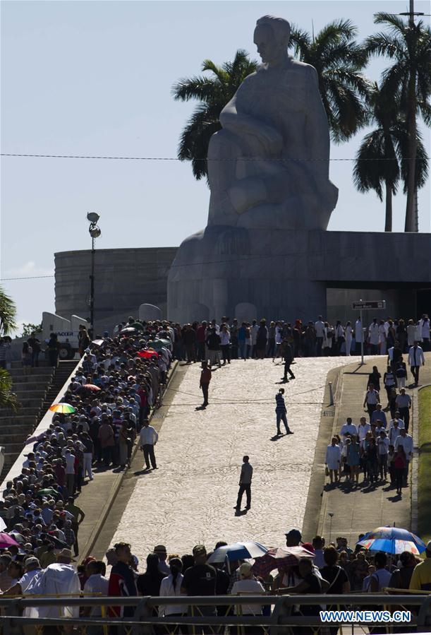 People line up in front of the Jose Marti Memorial to pay tributes to Cuban revolutionary leader Fidel Castro, in Havana, capital of Cuba, on Nov. 28, 2016. With music, alcohol sales and baseball games suspended, Cuba's capital Havana has been immersed in grief and silence in a nine-day period of mourning after Cuban revolutionary leader Fidel Castro passed away late Friday at the age of 90. (Xinhua/David de la Paz)