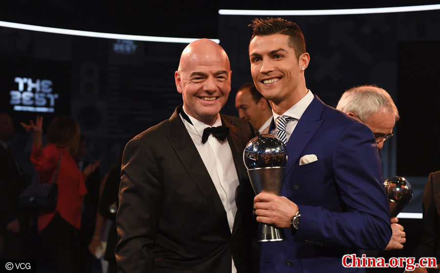 Cristiano Ronaldo of Portugal and Real Madrid poses with The Best FIFA Men's Player Award and FIFA President Gianni Infantino during The Best FIFA Football Awards at TPC Studio on January 9, 2017 in Zurich, Switzerland. |