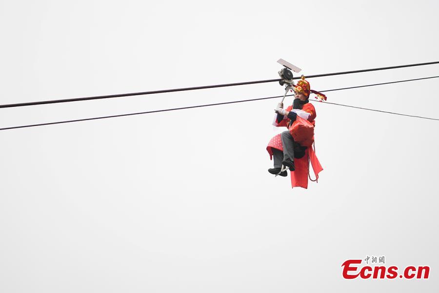 A man hangs off a cableway at Shiniuzhai National Geological Park. He is dressed as the Chinese God of Wealth which is believed to bring good fortune and wealth to people. [Photo/Chinanews.com]