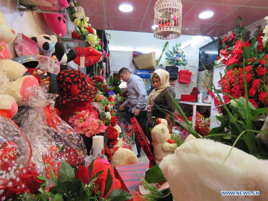 An Iraqi woman buys flowers at a gift shop ahead of Valentine's Day in Baghdad, Iraq, Feb. 13, 2017. (Xinhua/Khalil Dawood)