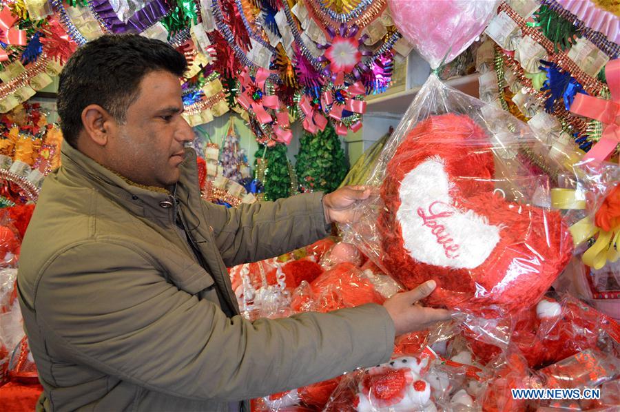 A man arranges gifts at his shop ahead of Valentine's Day in southwest Pakistan's Quetta, Feb. 13, 2017. (Xinhua/Irfan)