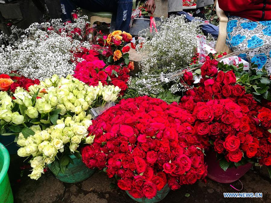 Photo taken on Feb. 13, 2017 shows a flower booth at City Market in Nairobi, Kenya. The price of each rose flower from 20 Kenyan Shillings to 50 Shillings (about 0.5 U.S. dollar) on the eve of Valentine's day. (Xinhua/Pan Siwei)