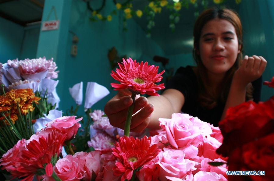 A vendor prepares flowers ahead of the Valentine's Day in Gresik, East Java, Indonesia, Feb. 13, 2017. (Xinhua/Kurniawan)