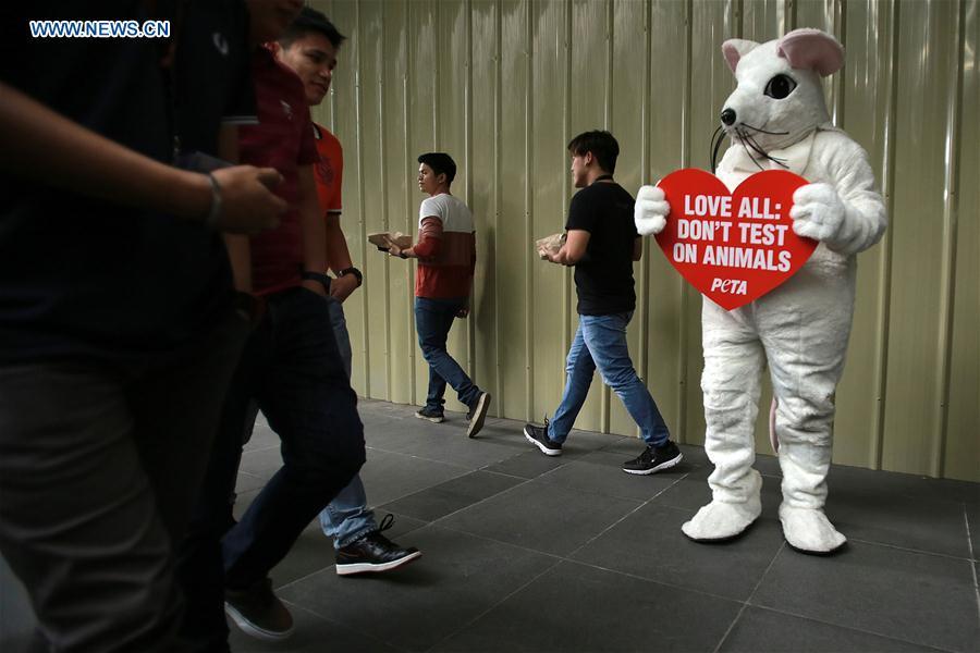 A member from PETA (People for the Ethical Treatment of Animals) dressed in a mouse costume holds a placard during a demonstration encouraging people to love all animals ahead of the Valentine's Day in Makati City, the Philippines, Feb. 13, 2017. (Xinhua/Rouelle Umali)