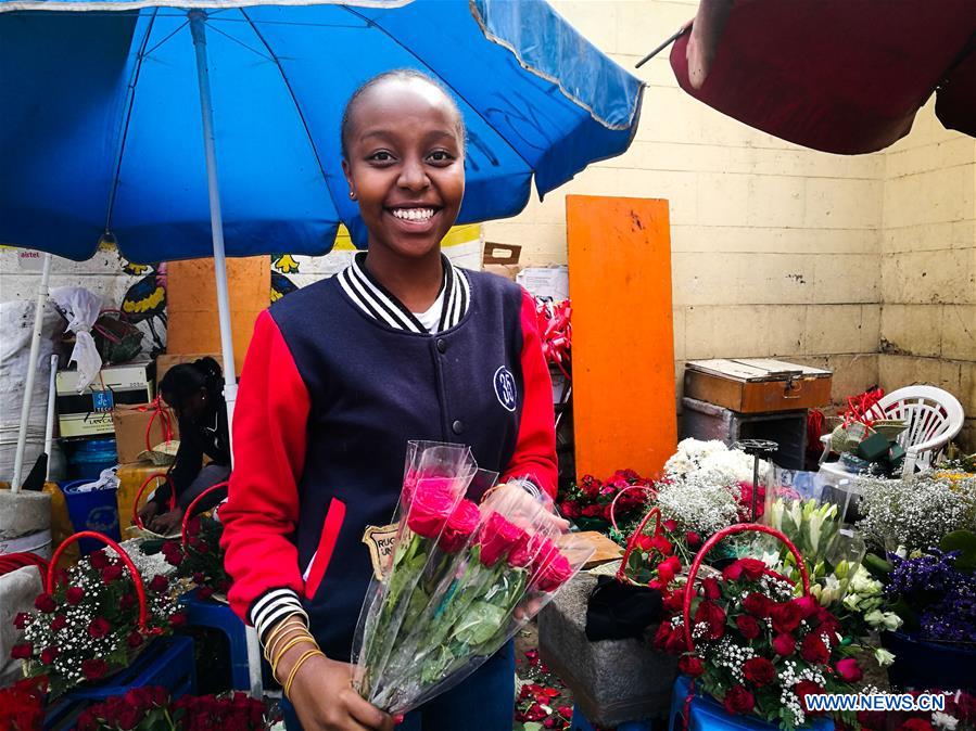 A girl shows flowers for sale at City Market in Nairobi, Kenya, on Feb. 13, 2017. The price of each rose flower from 20 Kenyan Shillings to 50 Shillings (about 0.5 U.S. dollar) on the eve of Valentine's day. (Xinhua/Pan Siwei)