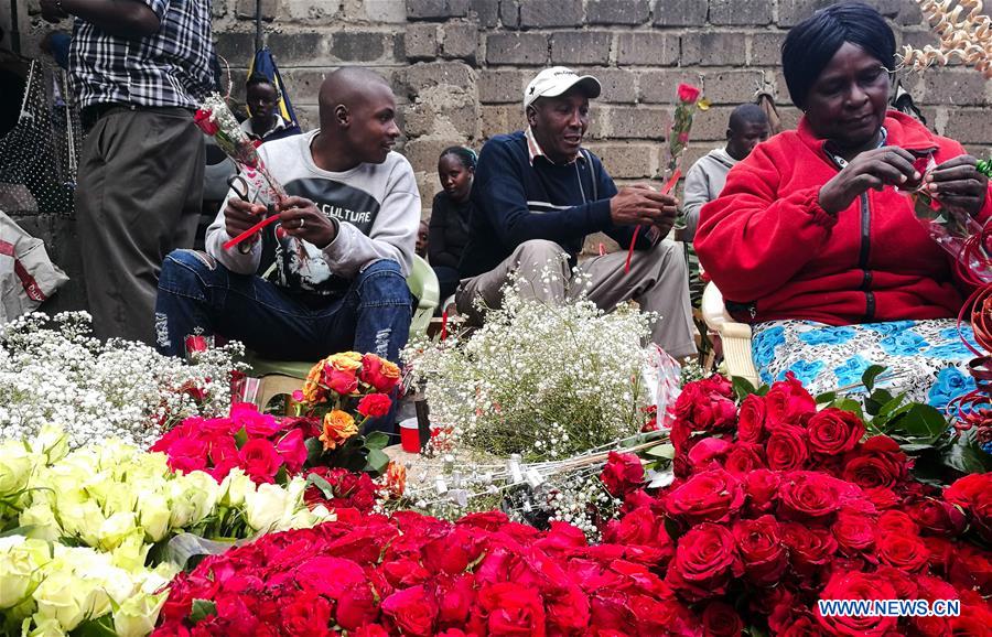 Vendors pack flowers at City Market in Nairobi, Kenya, on Feb. 13, 2017. The price of each rose flower from 20 Kenyan Shillings to 50 Shillings (about 0.5 U.S. dollar) on the eve of Valentine's day. (Xinhua/Pan Siwei)