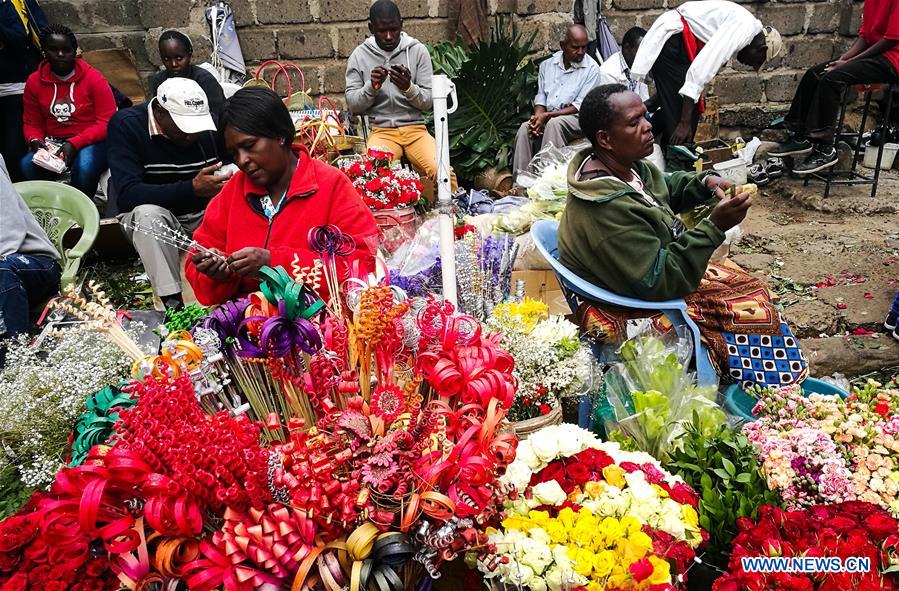 Vendors pack flowers at City Market in Nairobi, Kenya, on Feb. 13, 2017. The price of each rose flower from 20 Kenyan Shillings to 50 Shillings (about 0.5 U.S. dollar) on the eve of Valentine's day. (Xinhua/Pan Siwei)