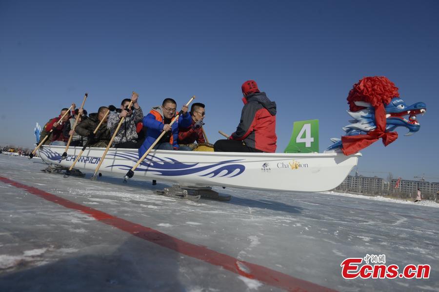 Participants compete in a dragon boat race held on ice in Duolun County, Xilingol League, North China's Inner Mongolia Autonomous Region, Feb. 26, 2017. The ice adaptation of dragon boat racing is part of programs to boost winter tourism. (Photo: China News Service/Liu Wenhua)