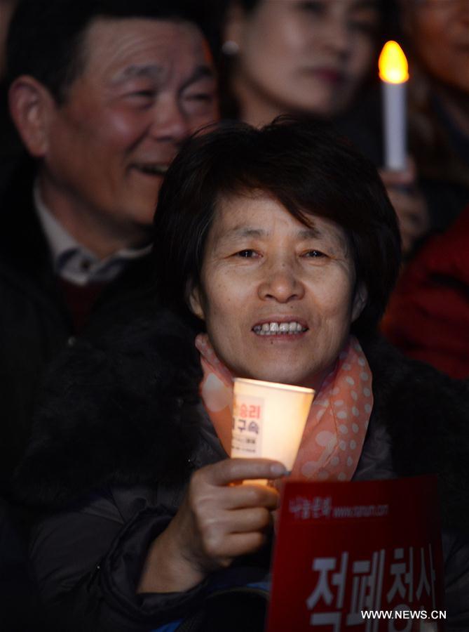 Demonstrators against South Korea's ousted leader Park Geun-hye attend the last candlelight rally at Gwanghwamun Square in Seoul, South Korea, March 11, 2017. Hundreds of thousands of South Koreans took to the streets on Saturday night for a last, festive candlelight rally to celebrate former President Park Geun-hye's ouster. (Xinhua/Liu Yun)