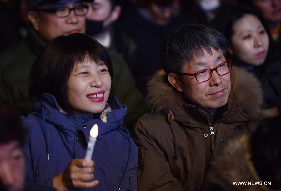 Demonstrators against South Korea's ousted leader Park Geun-hye attend the last candlelight rally at Gwanghwamun Square in Seoul, South Korea, March 11, 2017. Hundreds of thousands of South Koreans took to the streets on Saturday night for a last, festive candlelight rally to celebrate former President Park Geun-hye's ouster. (Xinhua/Liu Yun)