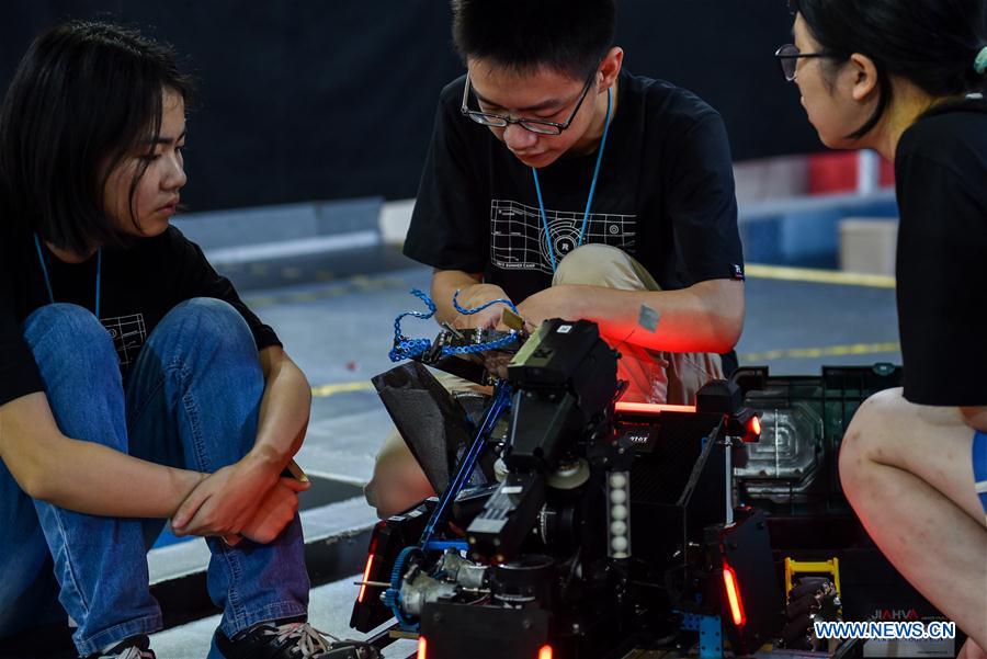 Students adjust a robot during the robot competition at RoboMaster 2017 summer camp in Shenzhen, south China's Guangdong Province, July 27, 2017. RoboMaster 2017 summer camp for high school students is held to promote robotics education and provide a platform for young inspiring engineers to showcase their robotics skills. About 45 high school students aged between 15 and 16 took part in this year's three-week camp. (Xinhua/Mao Siqian)