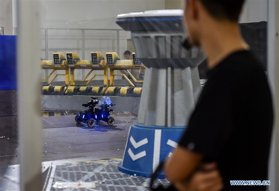 A student looks at robot matches at RoboMaster 2017 summer camp in Shenzhen, south China's Guangdong Province, July 27, 2017. RoboMaster 2017 summer camp for high school students is held to promote robotics education and provide a platform for young inspiring engineers to showcase their robotics skills. About 45 high school students aged between 15 and 16 took part in this year's three-week camp. (Xinhua/Mao Siqian)